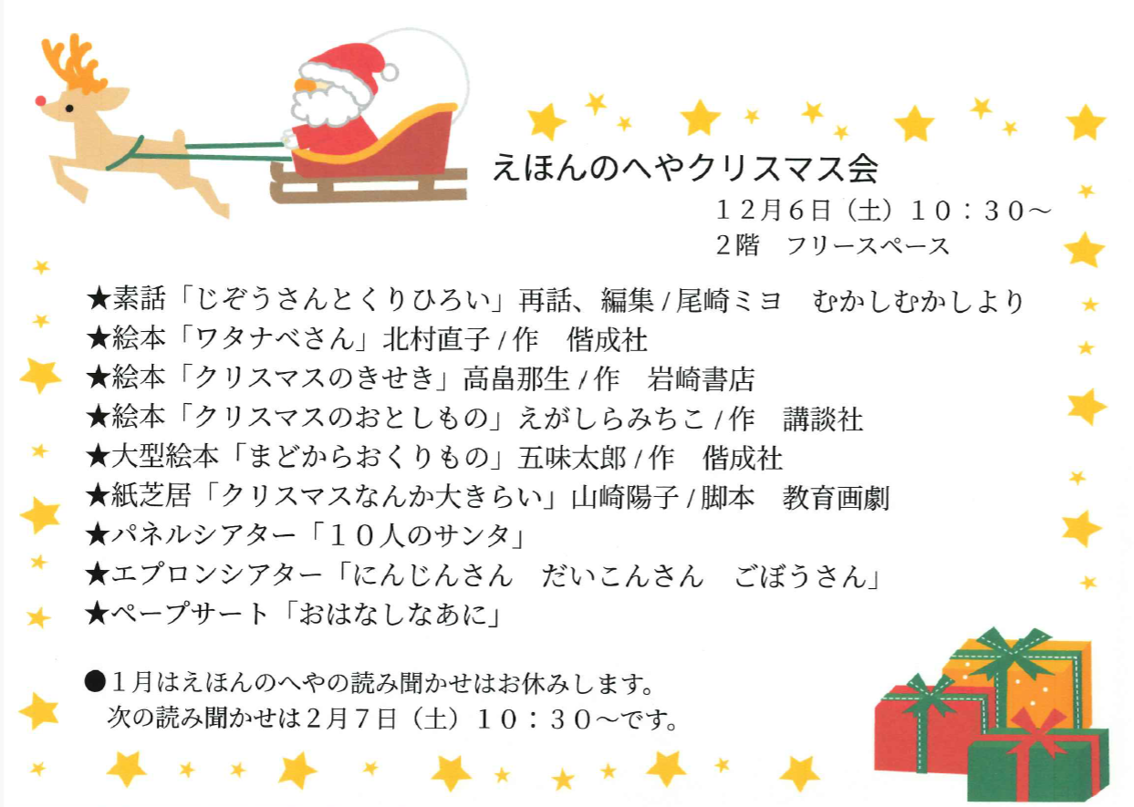 ボランティアグループ「えほんのへや」さんによるクリスマス会(読み聞かせ会)を開催します。