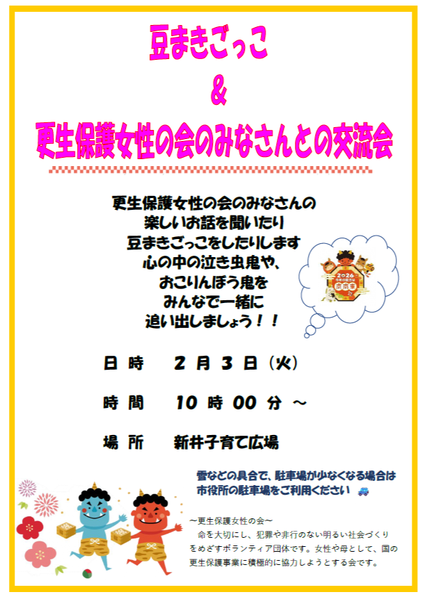 2月3日(火)10:00~「豆まきごっこ&更生保護女性の会のみなさんとの交流会」を開催します。詳しくはチラシをご覧ください。
